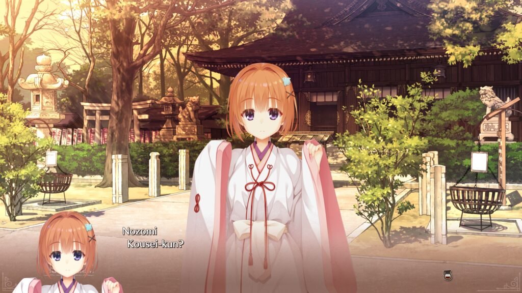 In Nozomis Route wiederum spielt der Kindheitsfreund-Aspekt mit ein – und eine spirituelle bzw. übernatürliche Komponente rund um einen alten Geist und einen Schreinkontext.