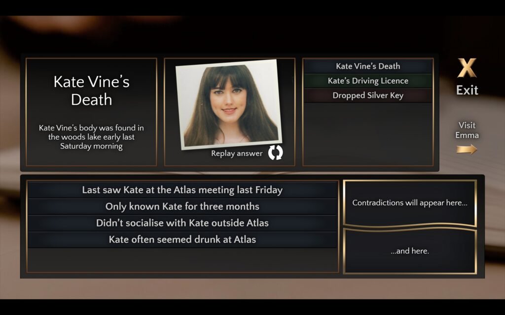 Mich hat das Game ein bisschen an Twin Peaks erinnert, allerdings ohne die komplett durchgeknallten Charaktere. Je weiter man spielt, umso mehr erfährt man über Kate und die Verstrickungen der anderen Charaktere in den Fall.