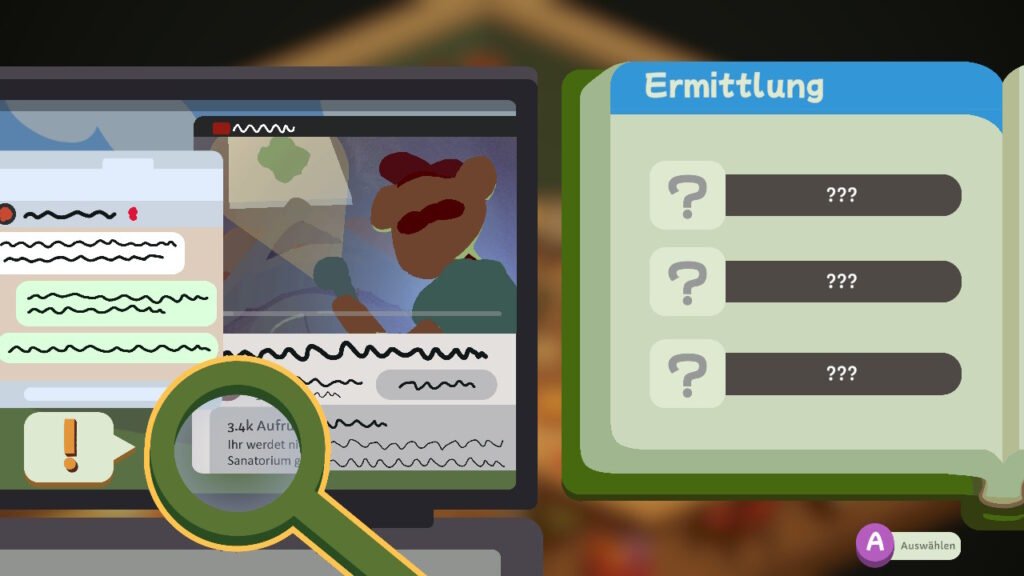 Mechanik: Du befragst Verdächtige, untersuchst Hinweise und füllst Lückentexte aus, um Schlussfolgerungen zu ziehen.