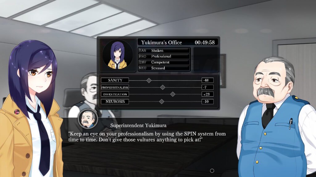 SPIN-System: Das Spiel verfolgt vier Attribute: Sanity, Professionalism, Investigation und Neurosis. Fast jede Entscheidung hat Einfluss auf diese Werte.