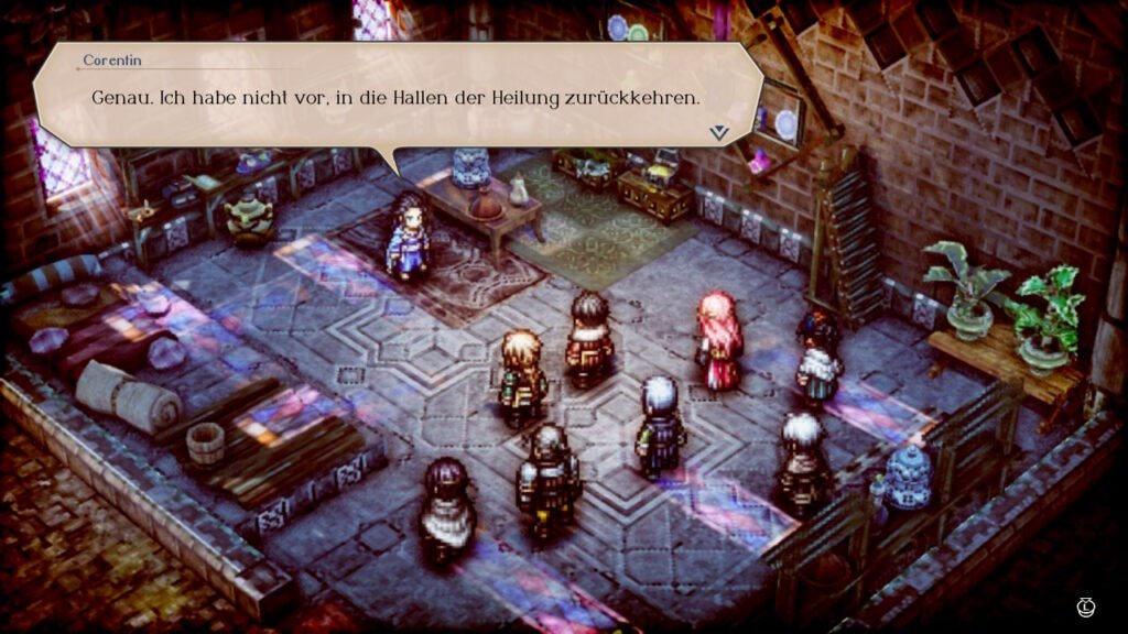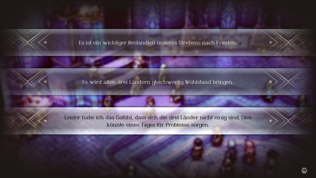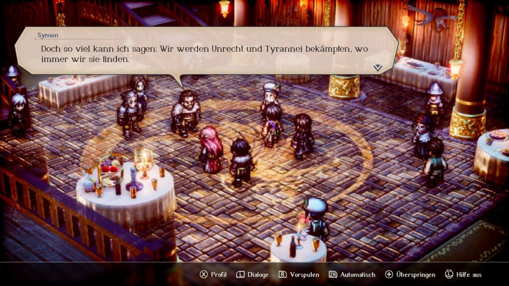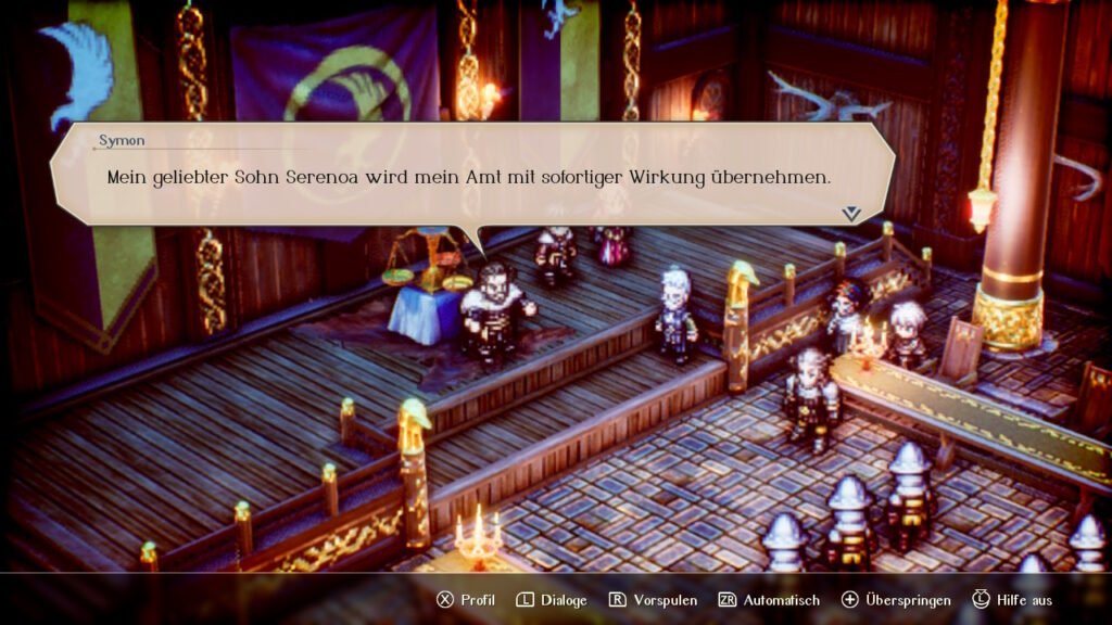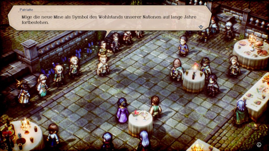 Optisch erinnert es mich mit seiner HD-2D sehr an Octopath Traveler. Politik spielt hier eine große Rolle und mit verschiedenen Antwortmöglichkeiten beeinflussen wir die Story.