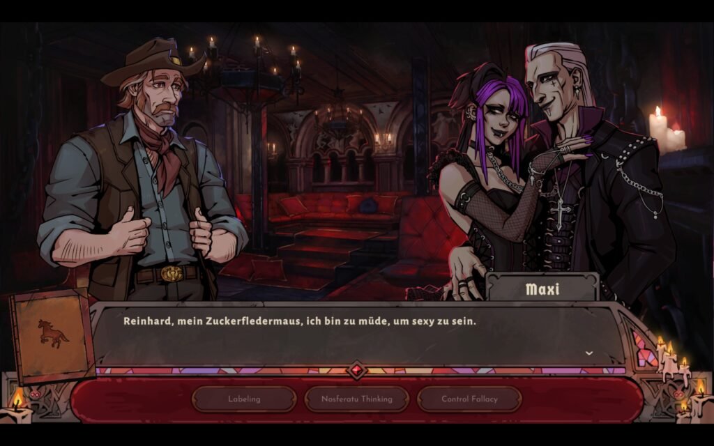 Alle Dialoge sind vertont, und das Setting – ein düsteres Gothic-Nachtclub-Ambiente – unterstreicht die einzigartige Stimmung.
